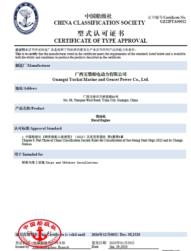1月29日,蓝狮在线船电最大排量船机YC16VCX系列获得CCS中国船级社颁发的型式认可证书。